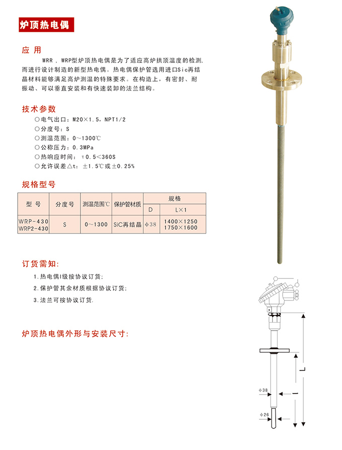 WRR , WRP 型爐頂熱電偶是為了適應高爐拱頂溫度的檢 測而進行設計別造的新熱電偶、熱電偶保護管選用進口 Sic 再結晶材料能夠滿足高爐測溫的特殊要求,在構造上,有密封、耐振動,可以垂直安裝和有快速裝卸的法蘭結構。