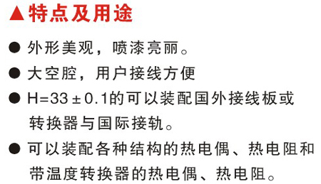 ●可以裝配各種結構的熱電偶、熱電阻和帶溫度轉換器的熱電偶、熱電阻。