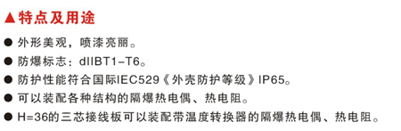 ●H=36的三芯接線板可以裝配帶溫度轉換器的隔爆熱電偶、熱電阻。