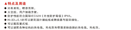 ●可以裝配各種結(jié)構(gòu)的熱電偶、熱電阻和帶溫度轉(zhuǎn)換器的熱電偶、熱電阻。