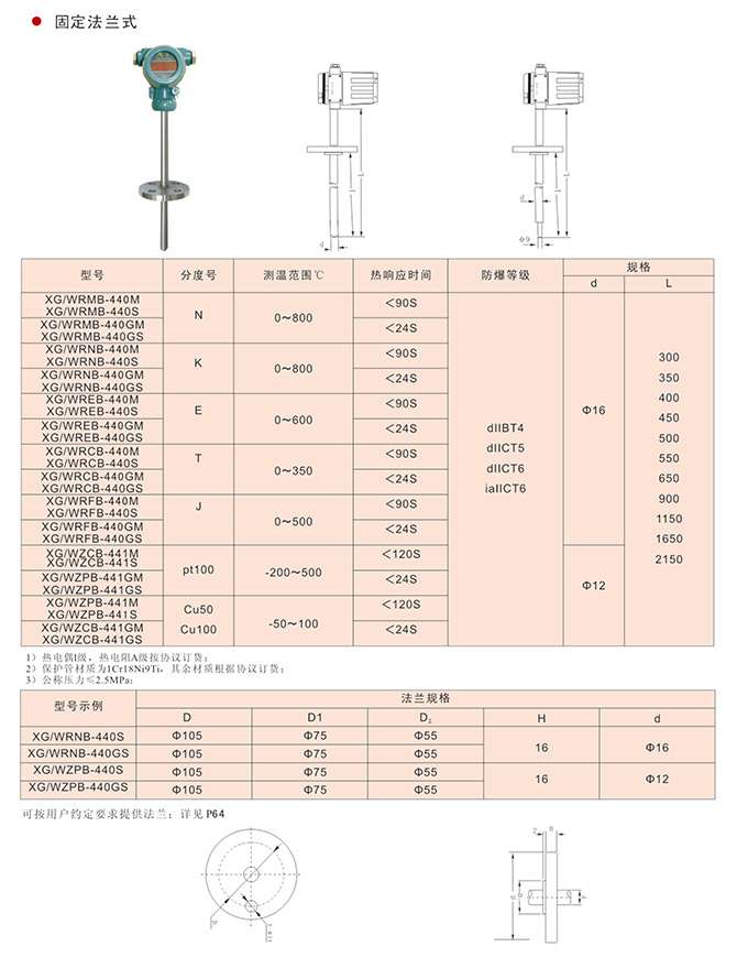 固定法蘭式,現(xiàn)場顯示一體化熱電偶(阻)一種新型結構的測溫儀表,現(xiàn)場LCD或LED數(shù)字顯示,溫度變送器二線4~20mA.DC信號輸出,感溫元件可采用鎧裝壓簧式抗震結構,感溫元件與上保護管采用圓筒隔爆結