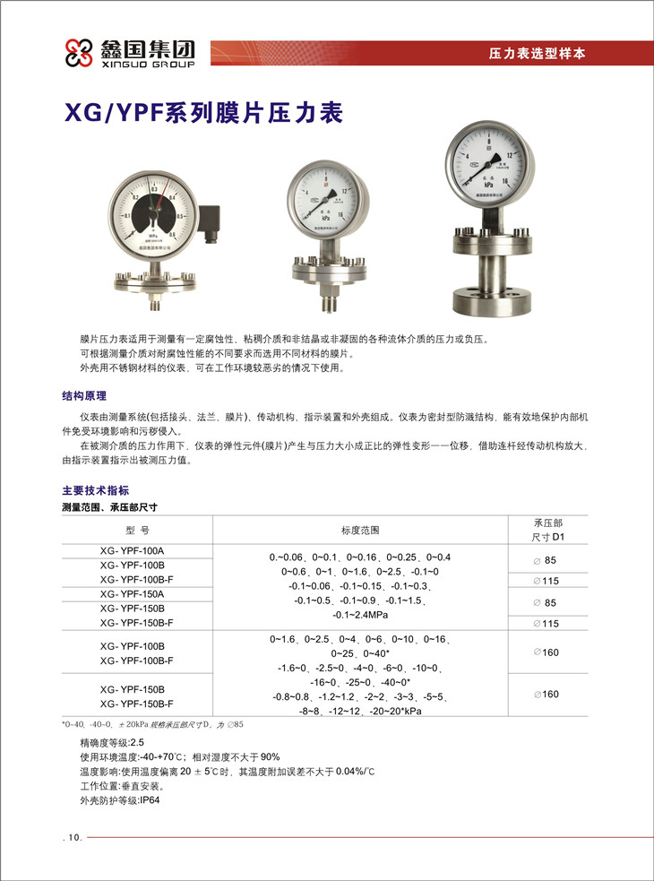 膜片壓力表適用于測量有一定腐蝕性,粘稠介質和非結晶或非凝固的各種流體介質的壓力或負壓。可根據測量介質對耐腐蝕性能的不同要求而選用不同材料的膜片。外殼用不銹鋼材料的膜片壓力表,可在工作環境較惡劣的情況