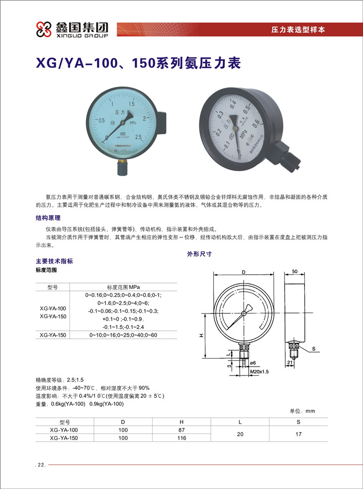 XG-YA-100/150系列氨壓力表,氨壓力表用于測量對普通碳系鋼,合金結構鋼,奧氏體類不銹鋼及錫鉛合金釬焊料無腐蝕作用,非結晶和凝固的各種介質的壓力。氨壓力表主要適用于化肥生產過程中和制冷設備中