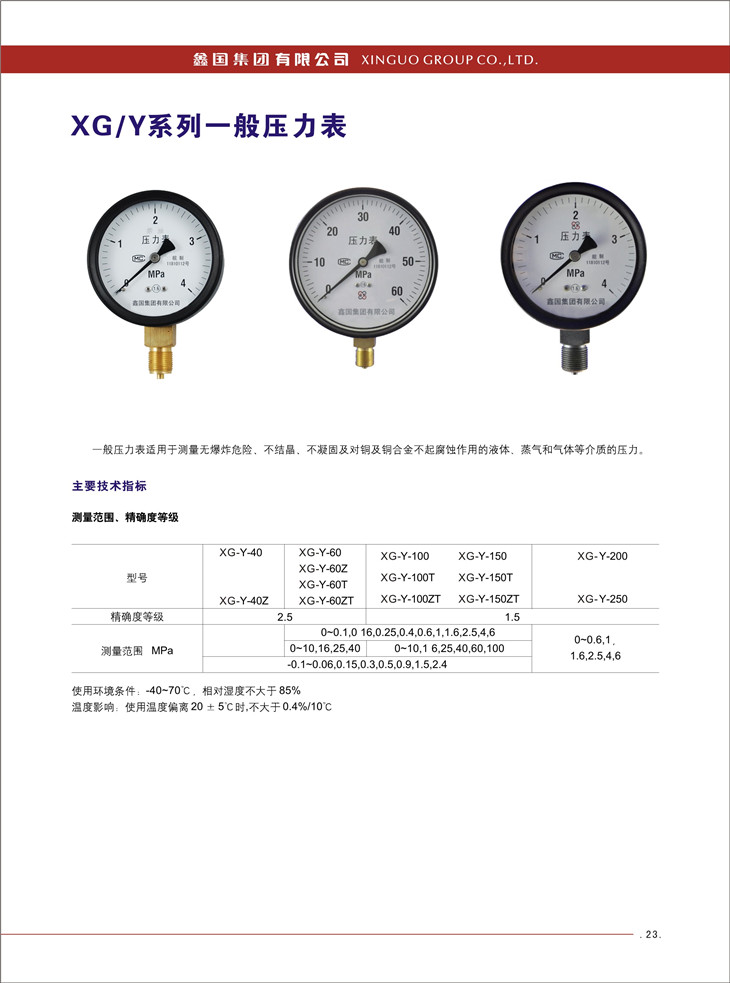 XG-Y系列一般壓力表,一般壓力表適用于測量無爆炸危險、不結(jié)晶、不凝固及對銅和銅合金不起腐蝕作用的液體、蒸汽和氣體等介質(zhì)的壓力。
