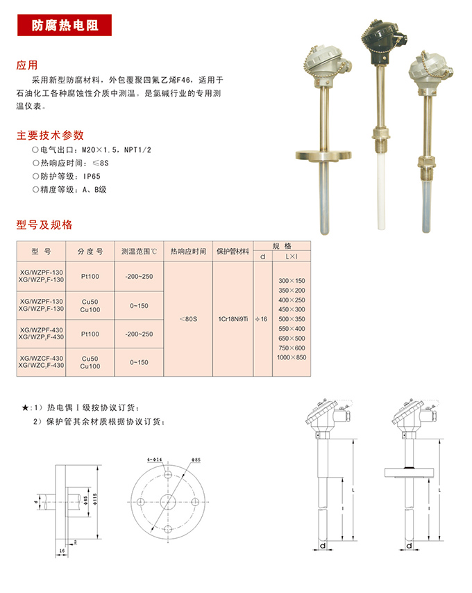 防腐熱電阻,采用新型防腐材料,外包覆聚四氟乙烯F46,防腐熱電阻適用于石油化工各種腐蝕性介質中測溫,是氯堿行業的專用測溫儀表。