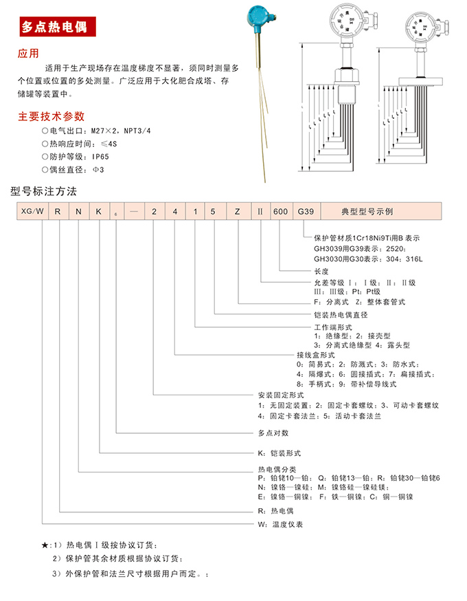 多點熱電偶,適用于生產現場存在溫度梯度不顯著,須同時測量多個位置或位置的多處測量。多點熱電偶廣泛應用于大化肥合成塔、存儲罐等裝置中。