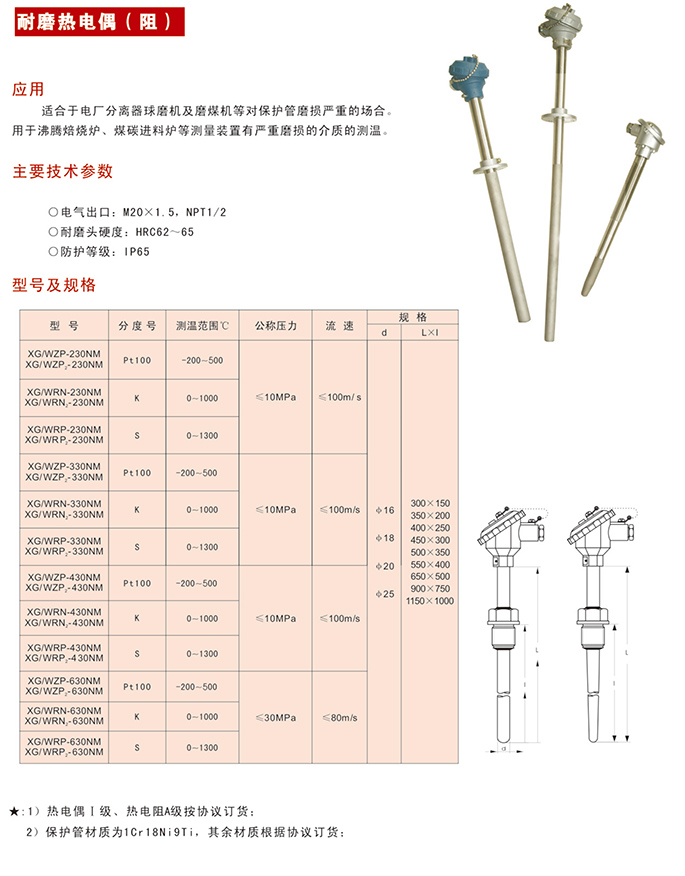 耐磨熱電偶(阻),適合于電廠分離器球磨機及磨煤機等對保護管磨損嚴重的場合。用于沸騰焙燒爐、煤炭進料爐等測量裝置有嚴重磨損的介質的測溫。
