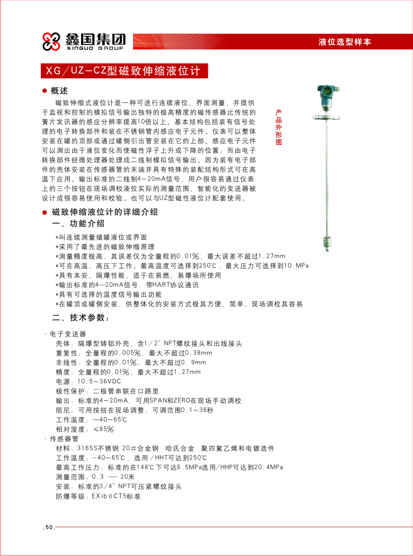 XG/UZ-CZ型磁致伸縮液位計,磁致伸縮式液位計是一種可進行連續液位,界面測量,并提供于監視和控制的模擬信號輸出獨特的、極高精度的磁傳感器,比傳統的簧片發訊器的感應分辨率提高10倍以上,基本結構包括裝有信號處理的電子轉換部件和裝在不銹鋼管內感應電子元件。磁致伸縮液位計可以整體安裝在罐的頂部或通過罐側引出管安裝在它的上部,感應電子元件可以測出由于液位變化而使磁性浮子上升或下降的位置,而由電子轉換部件經微處理器處理成二線制模擬信號輸出。因為裝有電子部件的殼體安裝在傳感器管的末端并具有特殊的裝配結構形式,可在高溫下應用。輸出標準的二線制4~20mA信號,用戶很容易通過儀表上的三個按鈕在現場調校液位實際的測量范圍,智能化的變送器被設計成很容易使用和校驗,也可以與 UZ 型磁性液位計配套使用。