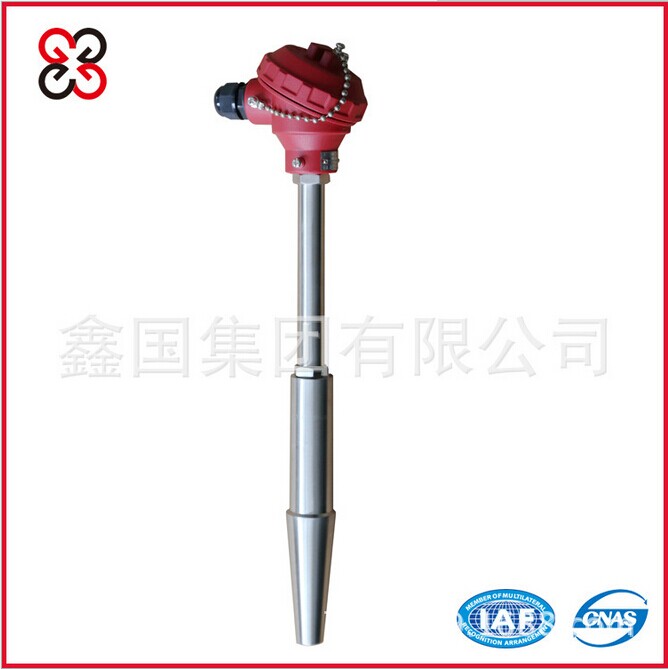 高溫高壓熱電偶(熱電阻),其整體鉆孔保護套管采用焊接的方法與主設(shè)備固定密封,它可用來測量電廠管路的蒸汽或水溫。根據(jù)所使用的壓力、溫度和流速的差異,具有兩種相應(yīng)的結(jié)構(gòu)和安裝方式,供用戶選擇。本熱電偶(熱電阻)采用分離式保護管結(jié)構(gòu),彈性壓緊測量元件方式,配鋁質(zhì)的防水接線盒。